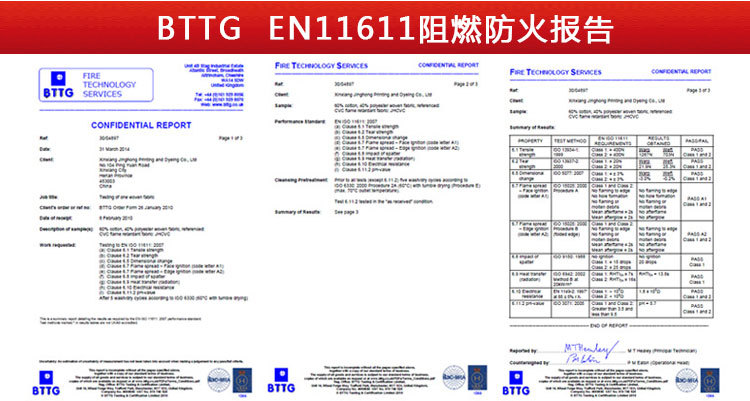 阻燃性能均能達到國標GB8965-98《阻燃防護服》要求,同時經SGS、TUV、BTTG等權威機構檢測,同時可達到歐盟"EN531、EN533、EN470-1、EN11612、NFPA2112、ASTMD6413、EN1149-3"等標準,達到歐共體、美國、英國一級品要求,產品遠銷歐洲、美國、日本、東南亞等國。