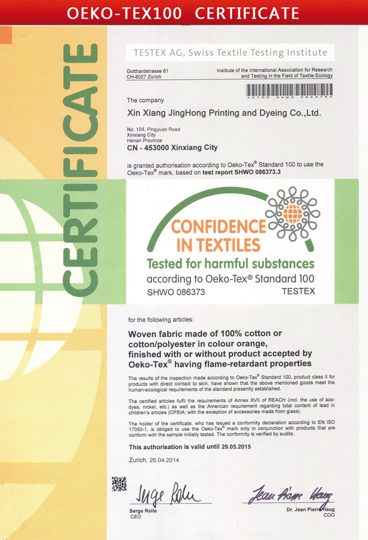 1. Oeko-Tex環保標準認證:保證了面料的環保安全和生態安全,保障您生命的健康和工作的安全!